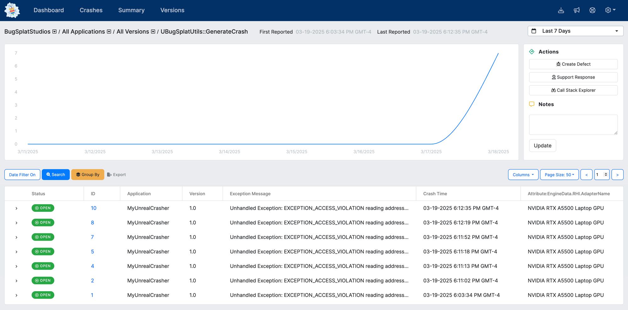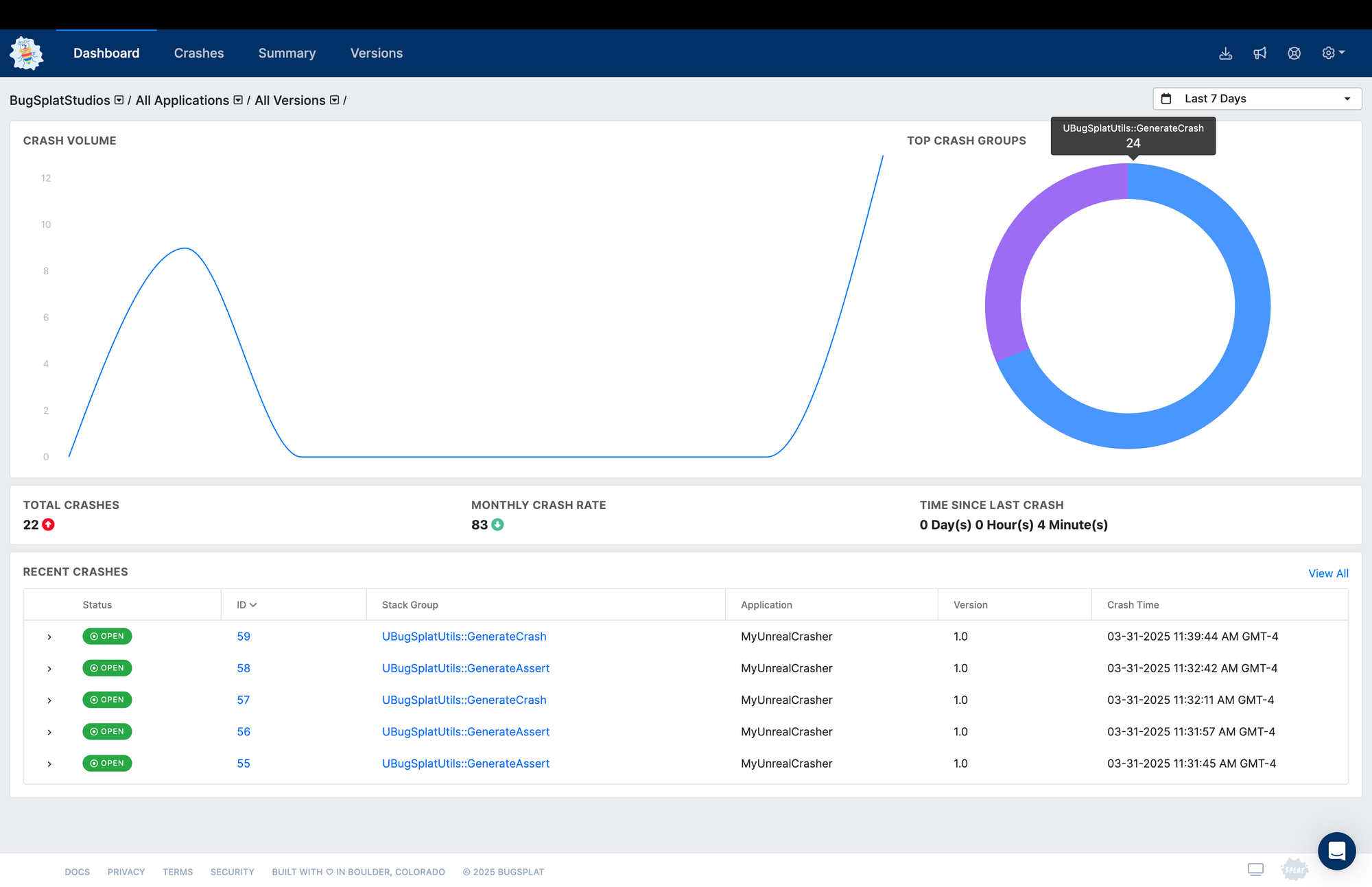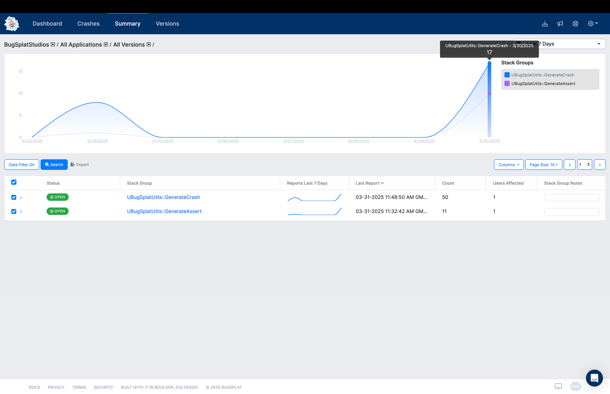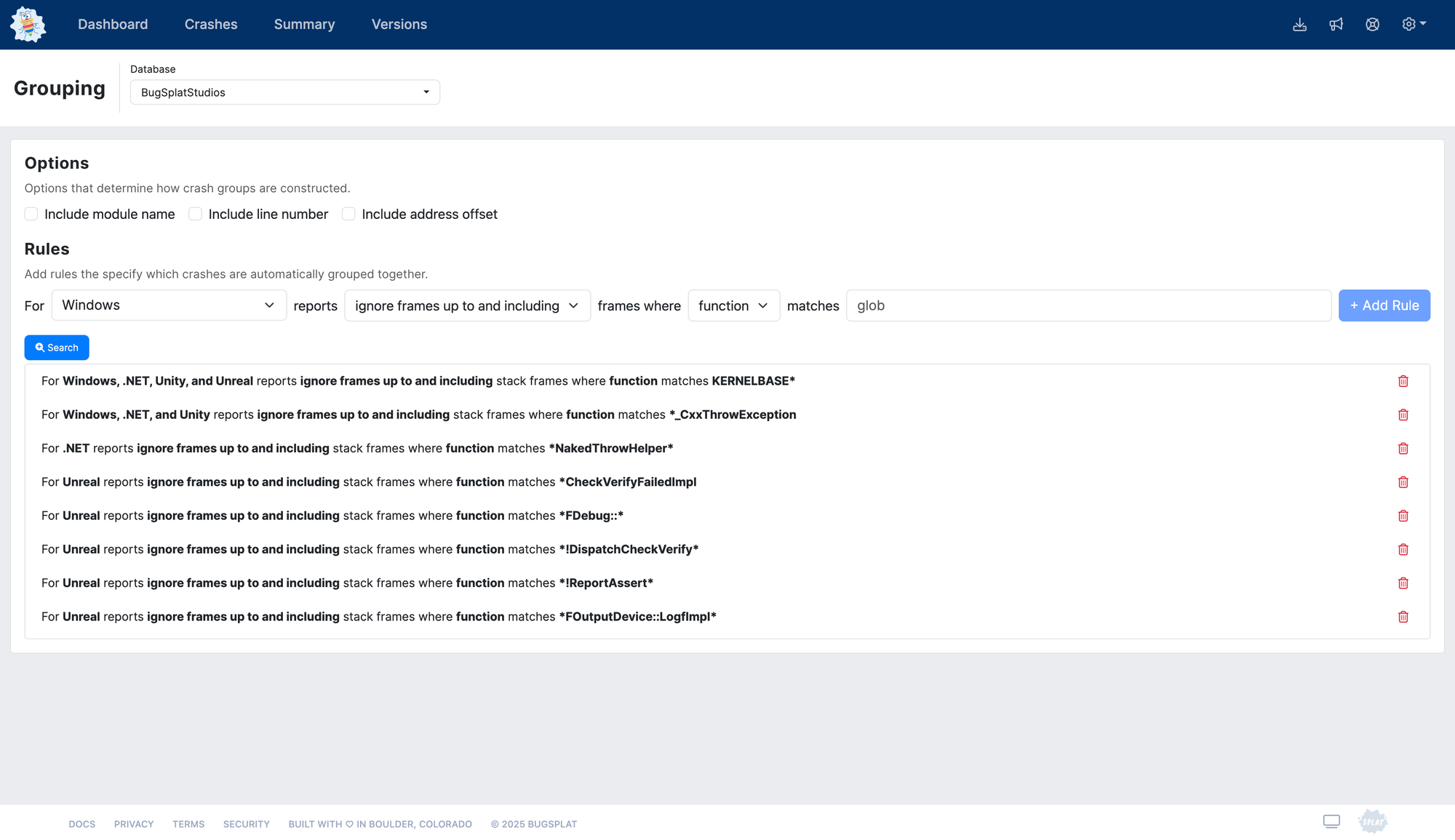 When dealing with hundreds, thousands, or even millions of crashes, it is essential to divide like crashes into groups that share the same underlying root cause. By sorting crashes by their root cause, developers can quickly identify the crashes that occur most frequently and/or affect the most significant number of users. Within BugSplat, groups of crashes can be created automatically by specifying Grouping Rules.
