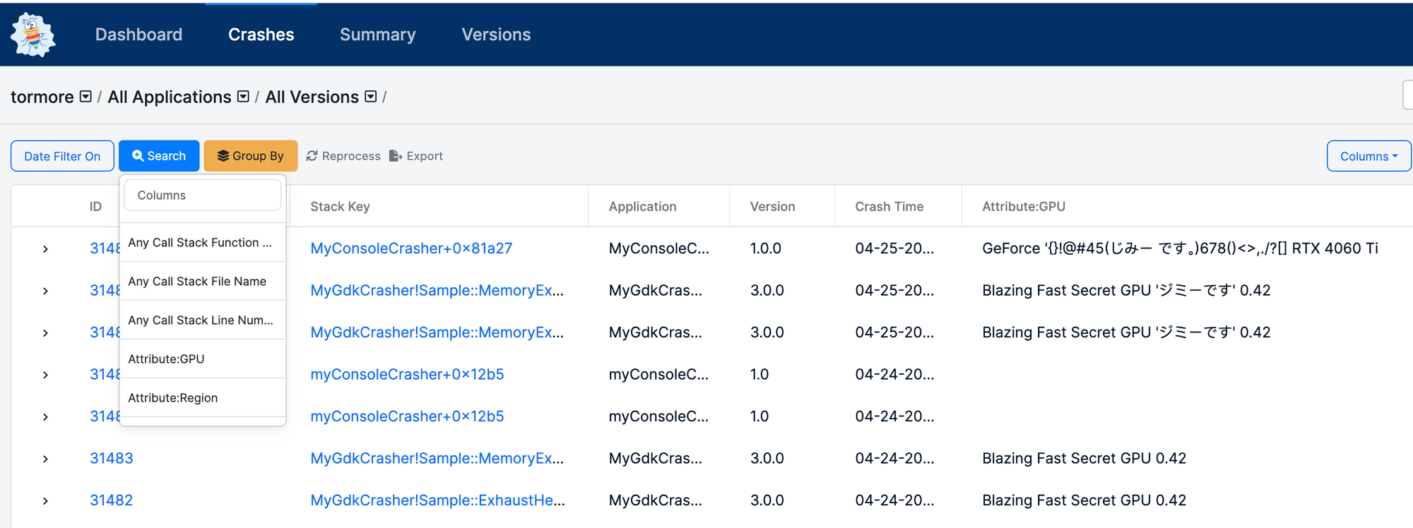 - Searchable and Filterable: Easily search and filter these attributes on the Crashes page.