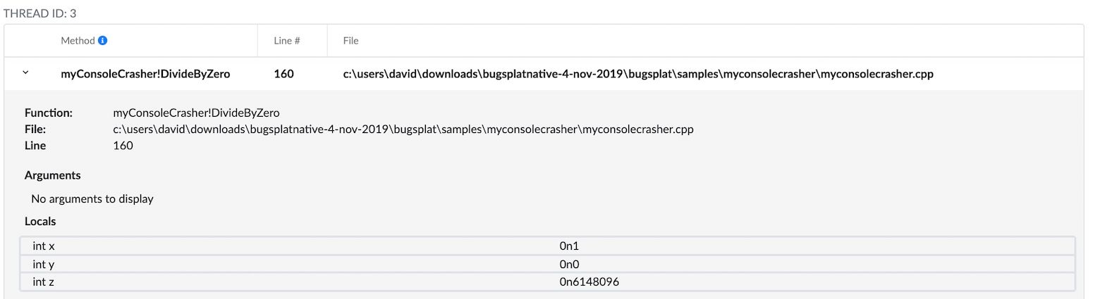 You can use our public database to explore some example crashes. You will need to sign in as the user Fred@bugsplat.com with the password Flintstone. Click the value in the ID column for one of these crashes to view local variables and function arguments on the Crash page.